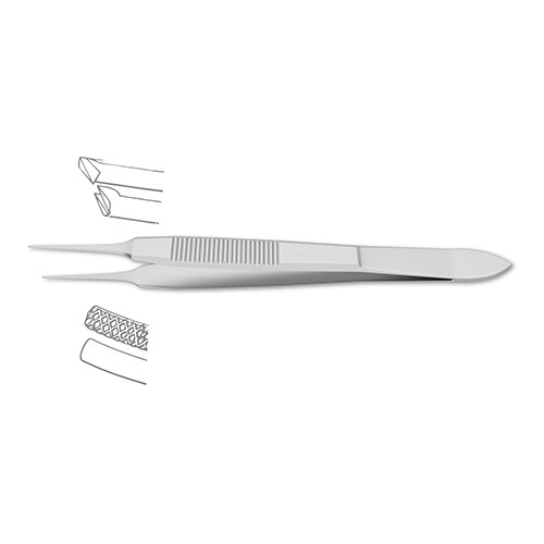 colibri style, 1×2 teeth, 45 degree angle, slightly overlapping, 3″ (7.6 cm) Harms Corneal Utility Forcep is a specialized tool designed for handling corneal tissue during ophthalmologic procedures. The delicate 1×2 teeth provide a firm yet atraumatic grip to the delicate corneal epithelium during surgery or cornea-scleral suturing. The ribbed handle with finger hole allows the surgeon to adjust grip for maximum control.