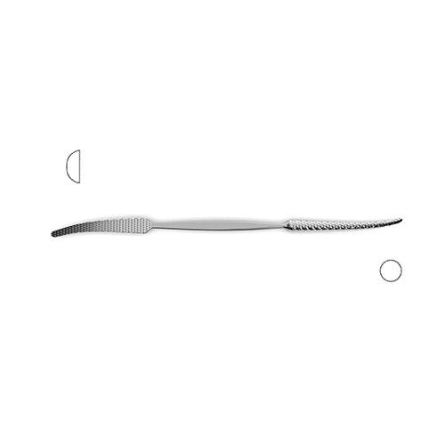 round blades, double-ended, 1 10.0 mm round blade tapers to 4.0 mm & 1 15.0 mm half-round blade tapers to 5.0 mm, 12″ (30.5 cm)Â Putti Bone Rasp is an instrument ideally suited for use in surgeries that require handling and particularly mild reshaping of bone such as in neurosurgical or orthopedic surgeries. . This instrument is double ended and features one round blade and another half round. The unique design of this rasp is in the leap shaped silhouette that tapers from 11.0 mm to 4.0 mm for the round blade and from 15.0 mm to 5.0 for the half round that allows it to be fit into slim and narrow spaces and effectively whittle down bone or hard tissue from any angle.