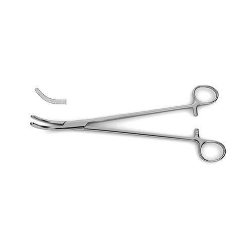 Wertheim Pedicle Clamp is most often used in situations that require the need to clamp off blood vessels or tumor pedicles. In this case, the clamp can be held in place due to the ratchet on the ring-handles, and can be released when desired. The curved, serrated jaws also help to reduce trauma to the area being grasped.